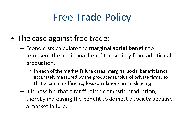 Free Trade Policy • The case against free trade: – Economists calculate the marginal social benefit to represent the additional benefit to society from additional production. • In each of the market failure cases, marginal social benefit is not accurately measured by the producer surplus of private firms, so that economic efficiency loss calculations are misleading. – It is possible that a tariff raises domestic production, thereby increasing the benefit to domestic society because a market failure.