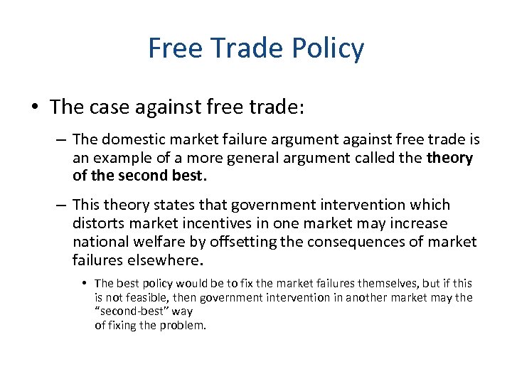 Free Trade Policy • The case against free trade: – The domestic market failure argument against free trade is an example of a more general argument called theory of the second best. – This theory states that government intervention which distorts market incentives in one market may increase national welfare by offsetting the consequences of market failures elsewhere. • The best policy would be to fix the market failures themselves, but if this is not feasible, then government intervention in another market may the “second-best” way of fixing the problem.