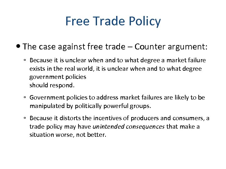 Free Trade Policy The case against free trade – Counter argument: ◦ Because it is unclear when and to what degree a market failure exists in the real world, it is unclear when and to what degree government policies should respond. ◦ Government policies to address market failures are likely to be manipulated by politically powerful groups. ◦ Because it distorts the incentives of producers and consumers, a trade policy may have unintended consequences that make a situation worse, not better.