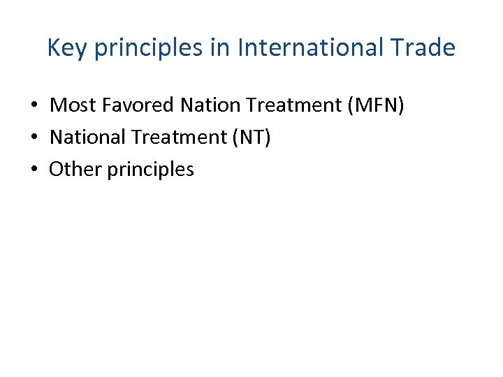 Key principles in International Trade • Most Favored Nation Treatment (MFN) • National Treatment (NT) • Other principles