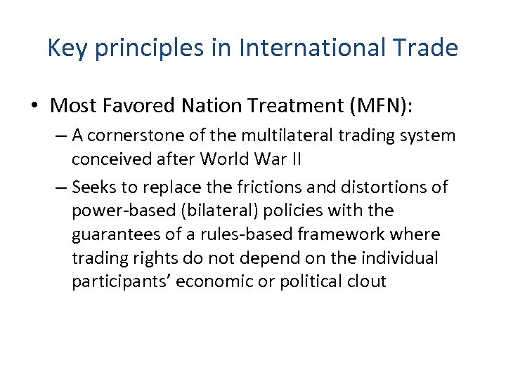 Key principles in International Trade • Most Favored Nation Treatment (MFN): – A cornerstone of the multilateral trading system conceived after World War II – Seeks to replace the frictions and distortions of power-based (bilateral) policies with the guarantees of a rules-based framework where trading rights do not depend on the individual participants’ economic or political clout