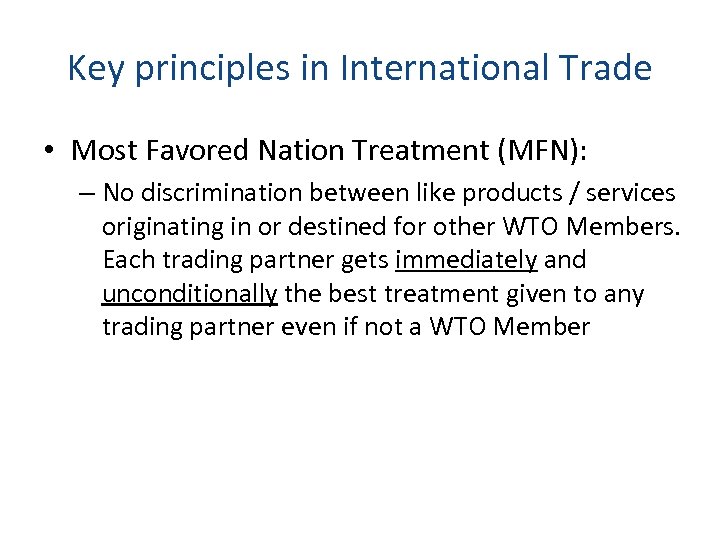 Key principles in International Trade • Most Favored Nation Treatment (MFN): – No discrimination between like products / services originating in or destined for other WTO Members. Each trading partner gets immediately and unconditionally the best treatment given to any trading partner even if not a WTO Member