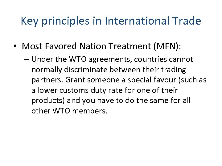 Key principles in International Trade • Most Favored Nation Treatment (MFN): – Under the WTO agreements, countries cannot normally discriminate between their trading partners. Grant someone a special favour (such as a lower customs duty rate for one of their products) and you have to do the same for all other WTO members.