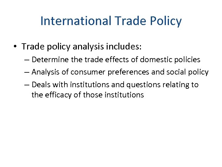 International Trade Policy • Trade policy analysis includes: – Determine the trade effects of domestic policies – Analysis of consumer preferences and social policy – Deals with institutions and questions relating to the efficacy of those institutions