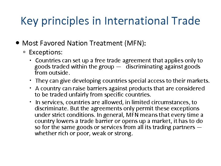 Key principles in International Trade Most Favored Nation Treatment (MFN): ◦ Exceptions: Countries can set up a free trade agreement that applies only to goods traded within the group — discriminating against goods from outside. They can give developing countries special access to their markets. A country can raise barriers against products that are considered to be traded unfairly from specific countries. In services, countries are allowed, in limited circumstances, to discriminate. But the agreements only permit these exceptions under strict conditions. In general, MFN means that every time a country lowers a trade barrier or opens up a market, it has to do so for the same goods or services from all its trading partners — whether rich or poor, weak or strong.