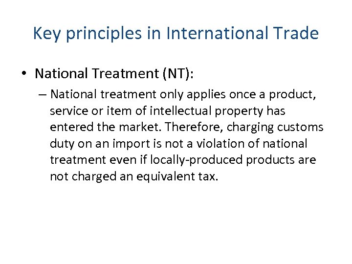 Key principles in International Trade • National Treatment (NT): – National treatment only applies once a product, service or item of intellectual property has entered the market. Therefore, charging customs duty on an import is not a violation of national treatment even if locally-produced products are not charged an equivalent tax.