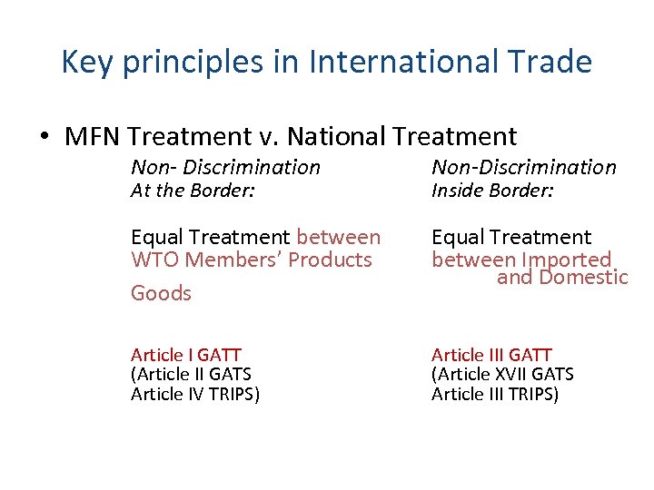 Key principles in International Trade • Most Favored Nation Treatment (MFN): – GATT – GATS – TRIPS