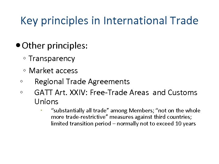 Key principles in International Trade Other principles: ◦ ◦ Transparency Market access Regional Trade Agreements GATT Art. XXIV: Free-Trade Areas and Customs Unions “substantially all trade” among Members; “not on the whole more trade-restrictive” measures against third countries; limited transition period – normally not to exceed 10 years