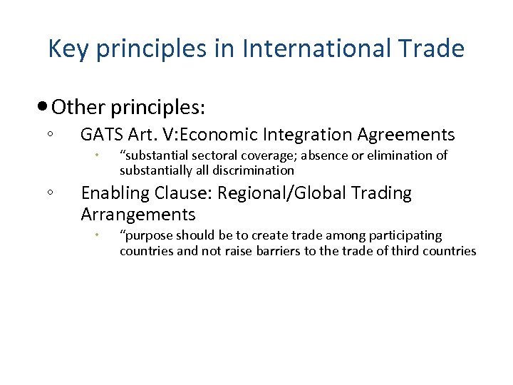 Key principles in International Trade Other principles: ◦ GATS Art. V: Economic Integration Agreements ◦ “substantial sectoral coverage; absence or elimination of substantially all discrimination Enabling Clause: Regional/Global Trading Arrangements “purpose should be to create trade among participating countries and not raise barriers to the trade of third countries