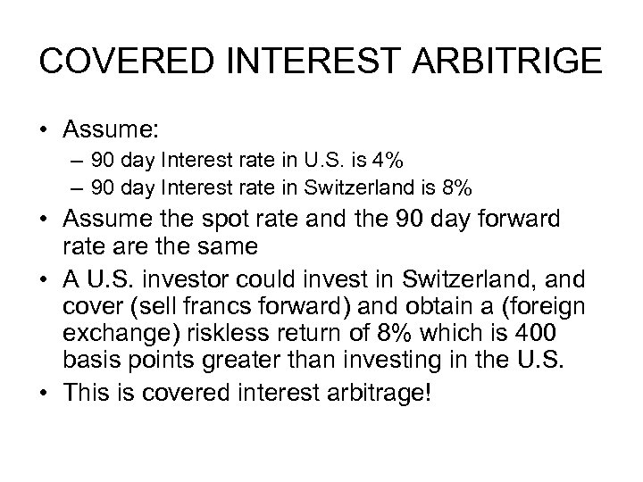 COVERED INTEREST ARBITRIGE • Assume: – 90 day Interest rate in U. S. is 4% – 90 day Interest rate in Switzerland is 8% • Assume the spot rate and the 90 day forward rate are the same • A U. S. investor could invest in Switzerland, and cover (sell francs forward) and obtain a (foreign exchange) riskless return of 8% which is 400 basis points greater than investing in the U. S. • This is covered interest arbitrage!