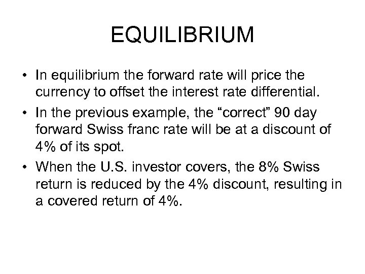 EQUILIBRIUM • In equilibrium the forward rate will price the currency to offset the interest rate differential. • In the previous example, the “correct” 90 day forward Swiss franc rate will be at a discount of 4% of its spot. • When the U. S. investor covers, the 8% Swiss return is reduced by the 4% discount, resulting in a covered return of 4%.