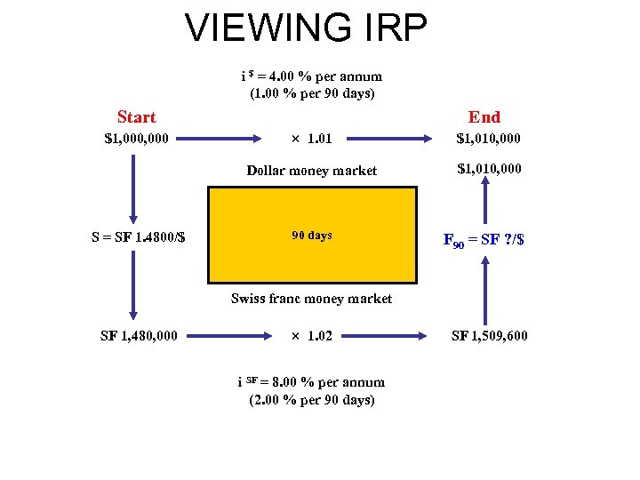 VIEWING IRP i $ = 4. 00 % per annum (1. 00 % per 90 days) Start End S = SF 1. 4800/$ 1. 01 $1, 010, 000 Dollar money market $1, 000 $1, 010, 000 90 days F 90 = SF ? /$ Swiss franc money market SF 1, 480, 000 1. 02 i SF = 8. 00 % per annum (2. 00 % per 90 days) SF 1, 509, 600