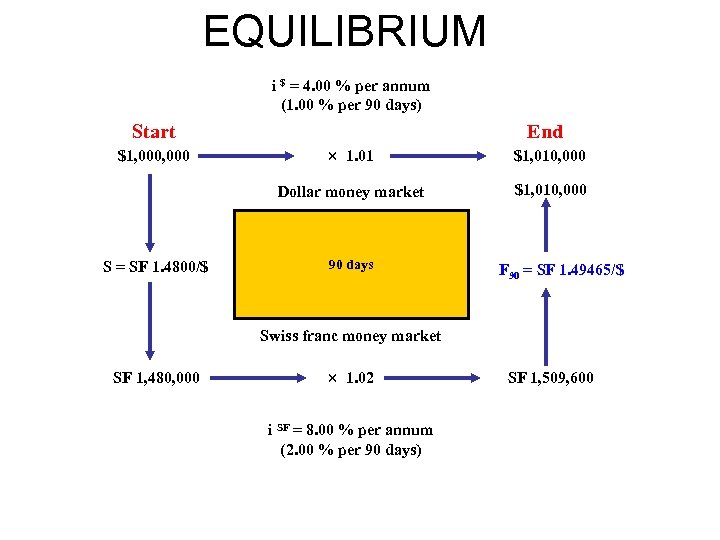 EQUILIBRIUM i $ = 4. 00 % per annum (1. 00 % per 90 days) Start End S = SF 1. 4800/$ 1. 01 $1, 010, 000 Dollar money market $1, 000 $1, 010, 000 90 days F 90 = SF 1. 49465/$ Swiss franc money market SF 1, 480, 000 1. 02 i SF = 8. 00 % per annum (2. 00 % per 90 days) SF 1, 509, 600