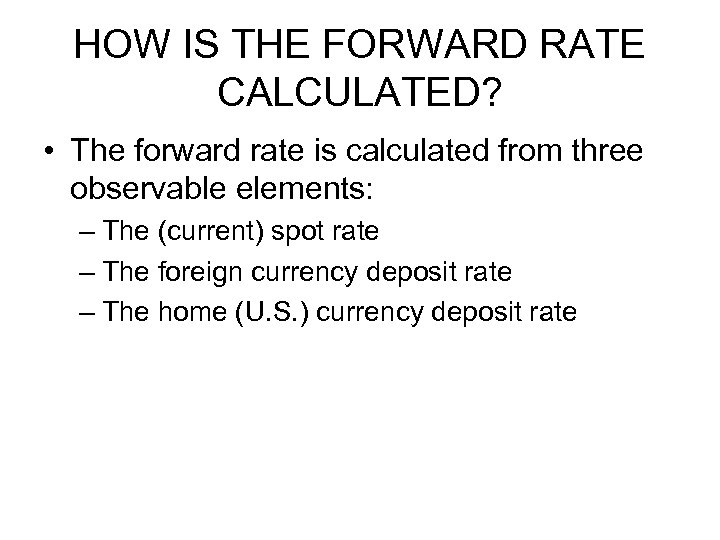 HOW IS THE FORWARD RATE CALCULATED? • The forward rate is calculated from three observable elements: – The (current) spot rate – The foreign currency deposit rate – The home (U. S. ) currency deposit rate
