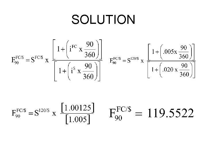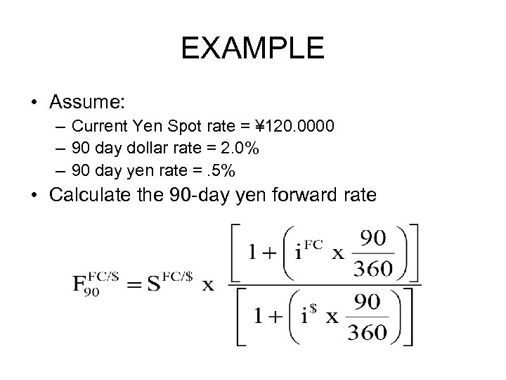 EXAMPLE • Assume: – Current Yen Spot rate = ¥ 120. 0000 – 90 day dollar rate = 2. 0% – 90 day yen rate =. 5% • Calculate the 90 -day yen forward rate