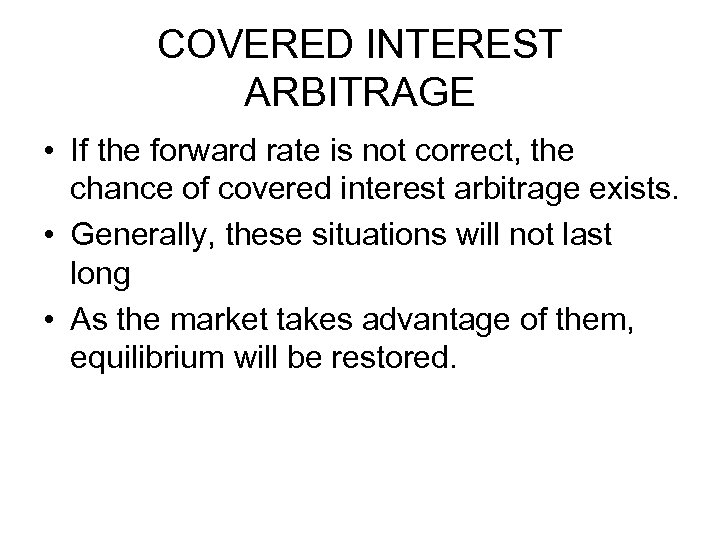 COVERED INTEREST ARBITRAGE • If the forward rate is not correct, the chance of covered interest arbitrage exists. • Generally, these situations will not last long • As the market takes advantage of them, equilibrium will be restored.