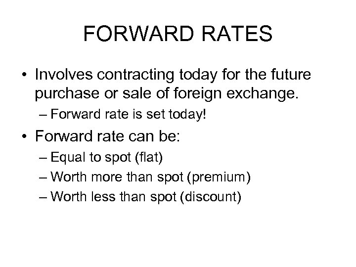 FORWARD RATES • Involves contracting today for the future purchase or sale of foreign exchange. – Forward rate is set today! • Forward rate can be: – Equal to spot (flat) – Worth more than spot (premium) – Worth less than spot (discount)