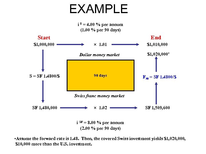 EXAMPLE i $ = 4. 00 % per annum (1. 00 % per 90 days) Start End S = SF 1. 4800/$ 1. 01 $1, 010, 000 Dollar money market $1, 000 $1, 020, 000* 90 days F 90 = SF 1. 4800/$ Swiss franc money market SF 1, 480, 000 1. 02 SF 1, 509, 600 i SF = 8. 00 % per annum (2. 00 % per 90 days) • Assume the forward rate is 1. 48. Then, the covered Swiss investment yields $1, 020, 000, $10, 000 more than the U. S. investment.