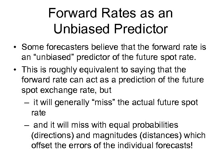 Forward Rates as an Unbiased Predictor • Some forecasters believe that the forward rate is an “unbiased” predictor of the future spot rate. • This is roughly equivalent to saying that the forward rate can act as a prediction of the future spot exchange rate, but – it will generally “miss” the actual future spot rate – and it will miss with equal probabilities (directions) and magnitudes (distances) which offset the errors of the individual forecasts!