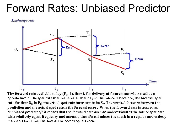 Forward Rates: Unbiased Predictor Exchange rate F 2 S 2 Error S 1 F 3 Error S 3 S 4 Time t 1 t 2 t 3 t 4 The forward rate available today (Ft, t+1), time t, for delivery at future time t+1, is used as a “predictor” of the spot rate that will exist at that day in the future. Therefore, the forecast spot rate for time St 2 is F 1; the actual spot rate turns out to be S 2. The vertical distance between the prediction and the actual spot rate is the forecast error. When the forward rate is termed an “unbiased predictor, ” it means that the forward rate over or underestimates the future spot rate with relatively equal frequency and amount, therefore it misses the mark in a regular and orderly manner. Over time, the sum of the errors equals zero.