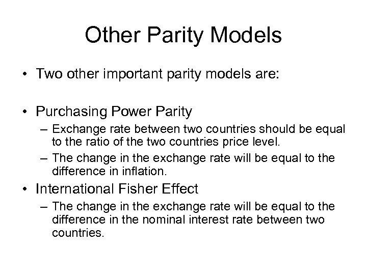 Other Parity Models • Two other important parity models are: • Purchasing Power Parity – Exchange rate between two countries should be equal to the ratio of the two countries price level. – The change in the exchange rate will be equal to the difference in inflation. • International Fisher Effect – The change in the exchange rate will be equal to the difference in the nominal interest rate between two countries.