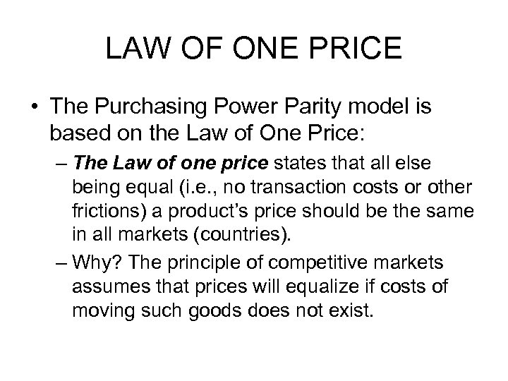 LAW OF ONE PRICE • The Purchasing Power Parity model is based on the Law of One Price: – The Law of one price states that all else being equal (i. e. , no transaction costs or other frictions) a product’s price should be the same in all markets (countries). – Why? The principle of competitive markets assumes that prices will equalize if costs of moving such goods does not exist.