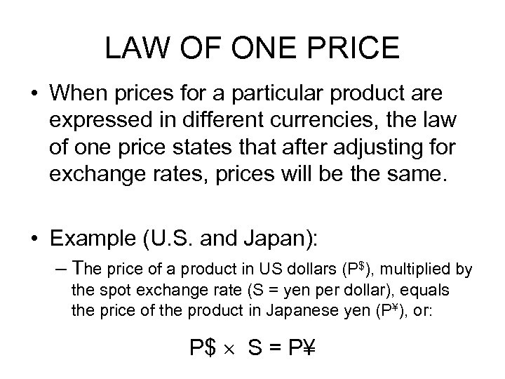 LAW OF ONE PRICE • When prices for a particular product are expressed in different currencies, the law of one price states that after adjusting for exchange rates, prices will be the same. • Example (U. S. and Japan): – The price of a product in US dollars (P$), multiplied by the spot exchange rate (S = yen per dollar), equals the price of the product in Japanese yen (P¥), or: P$ S = P¥