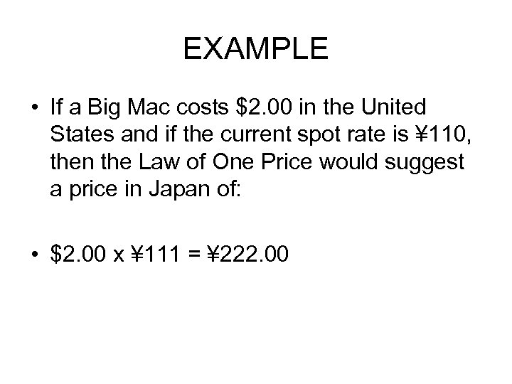 EXAMPLE • If a Big Mac costs $2. 00 in the United States and if the current spot rate is ¥ 110, then the Law of One Price would suggest a price in Japan of: • $2. 00 x ¥ 111 = ¥ 222. 00