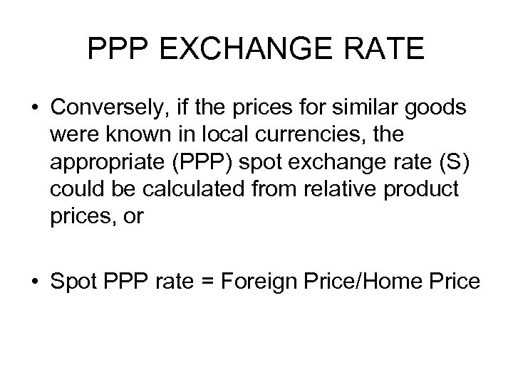 PPP EXCHANGE RATE • Conversely, if the prices for similar goods were known in local currencies, the appropriate (PPP) spot exchange rate (S) could be calculated from relative product prices, or • Spot PPP rate = Foreign Price/Home Price