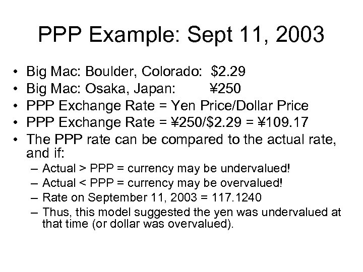 PPP Example: Sept 11, 2003 • • • Big Mac: Boulder, Colorado: $2. 29 Big Mac: Osaka, Japan: ¥ 250 PPP Exchange Rate = Yen Price/Dollar Price PPP Exchange Rate = ¥ 250/$2. 29 = ¥ 109. 17 The PPP rate can be compared to the actual rate, and if: – – Actual > PPP = currency may be undervalued! Actual < PPP = currency may be overvalued! Rate on September 11, 2003 = 117. 1240 Thus, this model suggested the yen was undervalued at that time (or dollar was overvalued).