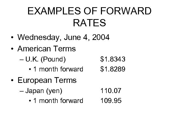 EXAMPLES OF FORWARD RATES • Wednesday, June 4, 2004 • American Terms – U. K. (Pound) • 1 month forward $1. 8343 $1. 8289 • European Terms – Japan (yen) • 1 month forward 110. 07 109. 95