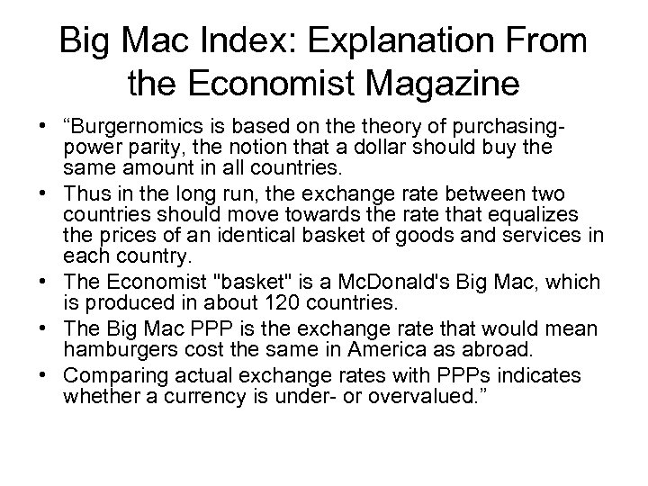 Big Mac Index: Explanation From the Economist Magazine • “Burgernomics is based on theory of purchasingpower parity, the notion that a dollar should buy the same amount in all countries. • Thus in the long run, the exchange rate between two countries should move towards the rate that equalizes the prices of an identical basket of goods and services in each country. • The Economist "basket" is a Mc. Donald's Big Mac, which is produced in about 120 countries. • The Big Mac PPP is the exchange rate that would mean hamburgers cost the same in America as abroad. • Comparing actual exchange rates with PPPs indicates whether a currency is under- or overvalued. ”