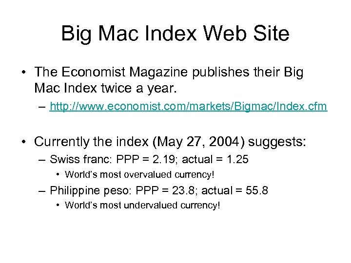 Big Mac Index Web Site • The Economist Magazine publishes their Big Mac Index twice a year. – http: //www. economist. com/markets/Bigmac/Index. cfm • Currently the index (May 27, 2004) suggests: – Swiss franc: PPP = 2. 19; actual = 1. 25 • World’s most overvalued currency! – Philippine peso: PPP = 23. 8; actual = 55. 8 • World’s most undervalued currency!