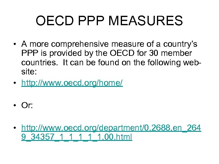 OECD PPP MEASURES • A more comprehensive measure of a country’s PPP is provided by the OECD for 30 member countries. It can be found on the following website: • http: //www. oecd. org/home/ • Or: • http: //www. oecd. org/department/0, 2688, en_264 9_34357_1_1_1, 00. html