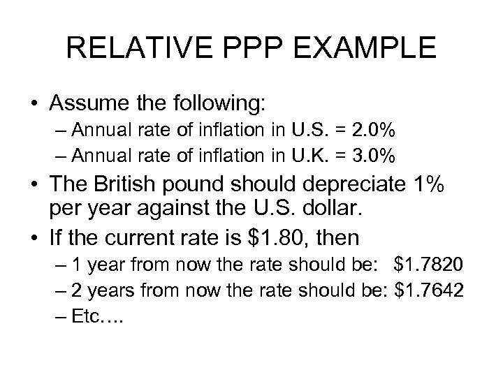 RELATIVE PPP EXAMPLE • Assume the following: – Annual rate of inflation in U. S. = 2. 0% – Annual rate of inflation in U. K. = 3. 0% • The British pound should depreciate 1% per year against the U. S. dollar. • If the current rate is $1. 80, then – 1 year from now the rate should be: $1. 7820 – 2 years from now the rate should be: $1. 7642 – Etc….