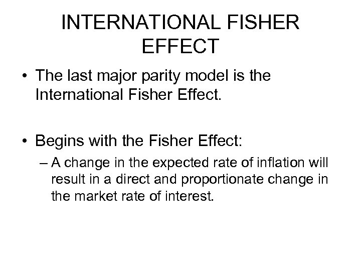 INTERNATIONAL FISHER EFFECT • The last major parity model is the International Fisher Effect. • Begins with the Fisher Effect: – A change in the expected rate of inflation will result in a direct and proportionate change in the market rate of interest.