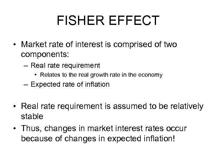 FISHER EFFECT • Market rate of interest is comprised of two components: – Real rate requirement • Relates to the real growth rate in the economy – Expected rate of inflation • Real rate requirement is assumed to be relatively stable • Thus, changes in market interest rates occur because of changes in expected inflation!