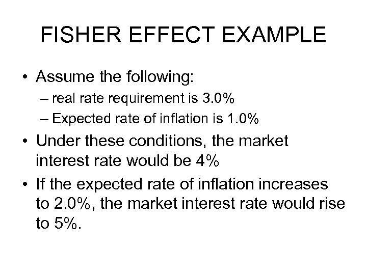 FISHER EFFECT EXAMPLE • Assume the following: – real rate requirement is 3. 0% – Expected rate of inflation is 1. 0% • Under these conditions, the market interest rate would be 4% • If the expected rate of inflation increases to 2. 0%, the market interest rate would rise to 5%.