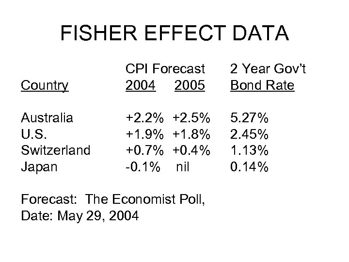 FISHER EFFECT DATA Country CPI Forecast 2004 2005 2 Year Gov’t Bond Rate Australia U. S. Switzerland Japan +2. 2% +1. 9% +0. 7% -0. 1% 5. 27% 2. 45% 1. 13% 0. 14% +2. 5% +1. 8% +0. 4% nil Forecast: The Economist Poll, Date: May 29, 2004