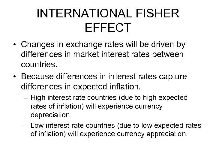 INTERNATIONAL FISHER EFFECT • Changes in exchange rates will be driven by differences in market interest rates between countries. • Because differences in interest rates capture differences in expected inflation. – High interest rate countries (due to high expected rates of inflation) will experience currency depreciation. – Low interest rate countries (due to low expected rates of inflation) will experience currency appreciation.