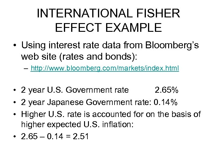INTERNATIONAL FISHER EFFECT EXAMPLE • Using interest rate data from Bloomberg’s web site (rates and bonds): – http: //www. bloomberg. com/markets/index. html • 2 year U. S. Government rate 2. 65% • 2 year Japanese Government rate: 0. 14% • Higher U. S. rate is accounted for on the basis of higher expected U. S. inflation: • 2. 65 – 0. 14 = 2. 51
