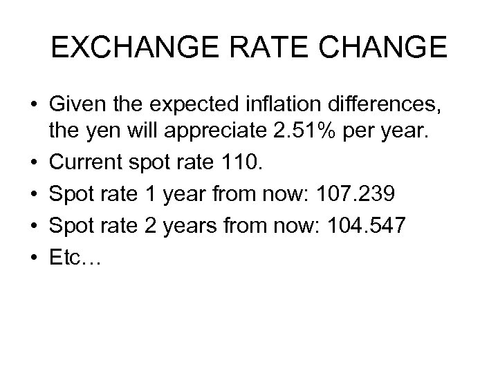 EXCHANGE RATE CHANGE • Given the expected inflation differences, the yen will appreciate 2. 51% per year. • Current spot rate 110. • Spot rate 1 year from now: 107. 239 • Spot rate 2 years from now: 104. 547 • Etc…