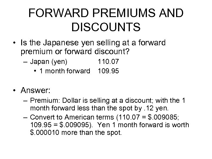 FORWARD PREMIUMS AND DISCOUNTS • Is the Japanese yen selling at a forward premium or forward discount? – Japan (yen) • 1 month forward 110. 07 109. 95 • Answer: – Premium: Dollar is selling at a discount; with the 1 month forward less than the spot by. 12 yen. – Convert to American terms (110. 07 = $. 009085; 109. 95 = $. 009095). Yen 1 month forward is worth $. 000010 more than the spot.