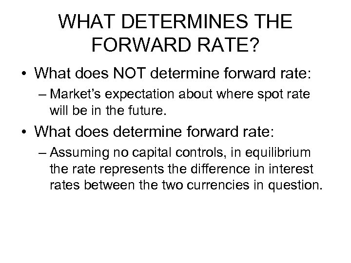 WHAT DETERMINES THE FORWARD RATE? • What does NOT determine forward rate: – Market’s expectation about where spot rate will be in the future. • What does determine forward rate: – Assuming no capital controls, in equilibrium the rate represents the difference in interest rates between the two currencies in question.