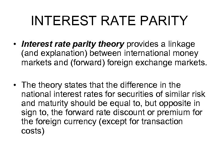 INTEREST RATE PARITY • Interest rate parity theory provides a linkage (and explanation) between international money markets and (forward) foreign exchange markets. • The theory states that the difference in the national interest rates for securities of similar risk and maturity should be equal to, but opposite in sign to, the forward rate discount or premium for the foreign currency (except for transaction costs)