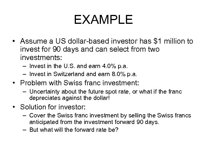 EXAMPLE • Assume a US dollar-based investor has $1 million to invest for 90 days and can select from two investments: – Invest in the U. S. and earn 4. 0% p. a. – Invest in Switzerland earn 8. 0% p. a. • Problem with Swiss franc investment: – Uncertainty about the future spot rate, or what if the franc depreciates against the dollar! • Solution for investor: – Cover the Swiss franc investment by selling the Swiss francs anticipated from the investment forward 90 days. – But what will the forward rate be?