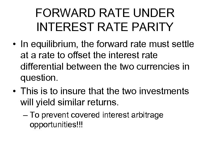 FORWARD RATE UNDER INTEREST RATE PARITY • In equilibrium, the forward rate must settle at a rate to offset the interest rate differential between the two currencies in question. • This is to insure that the two investments will yield similar returns. – To prevent covered interest arbitrage opportunities!!!