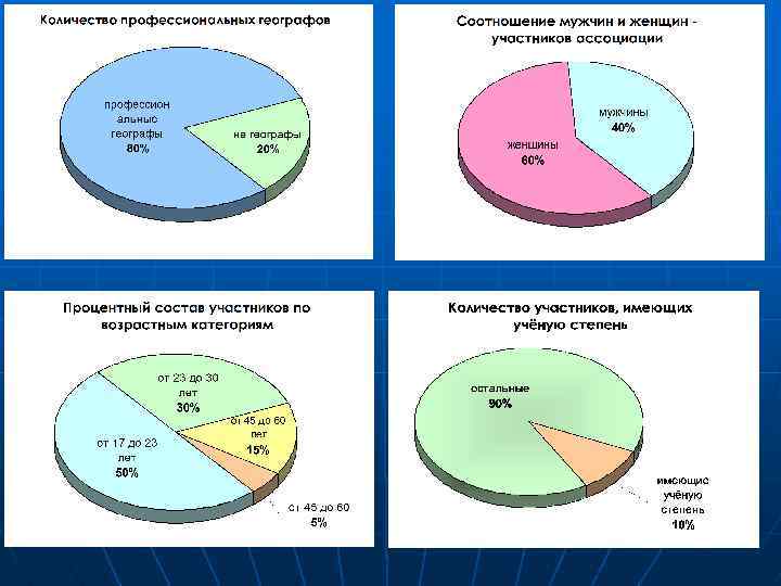 Профессиональный состав: Географы: n Геологи; n Почвоведы; n Картографы; n специалисты по ГИС и в сфере туризма; n Историки; n Политологи; n Экономисты; n Этнологи; n Биологи; В Ассоциацию могут войти не только профессиональные географы, но и представители других смежных с географией наук.