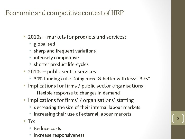 Economic and competitive context of HRP • 2010 s – markets for products and services: • • globalised sharp and frequent variations intensely competitive shorter product life-cycles • 2010 s – public sector services • 30% funding cuts: Doing more & better with less: “ 3 Es” • Implications for firms / public sector organisations: Flexible response to changes in demand • Implications for firms’ / organisations’ staffing • decreasing the size of their internal labour markets • increasing their use of external labour markets • To: • Reduce costs • Increase responsiveness 3
