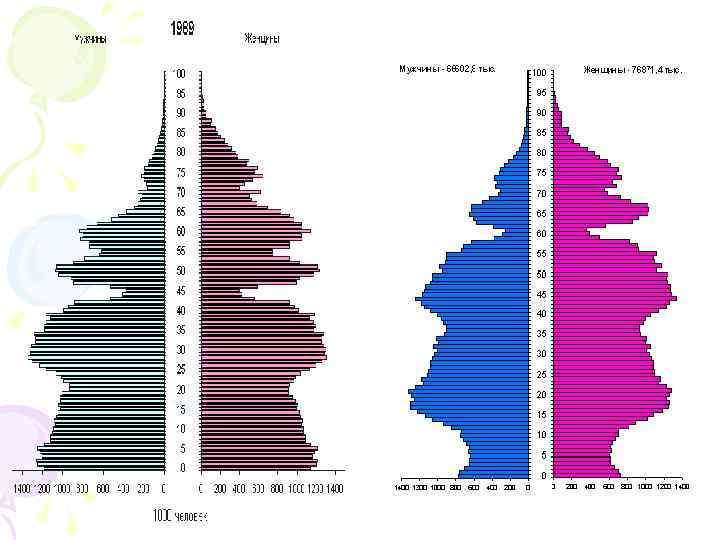 ПОЛОВОЗРАСТНАЯ ПИРАМИДА • ПП - графическое изображение данных о половозрастном составе населения. • Ось ординат - шкала возрастных групп (по возрастанию снизу вверх) • Ось абсцисс - численность (слева - мужчины, справа - женщины).